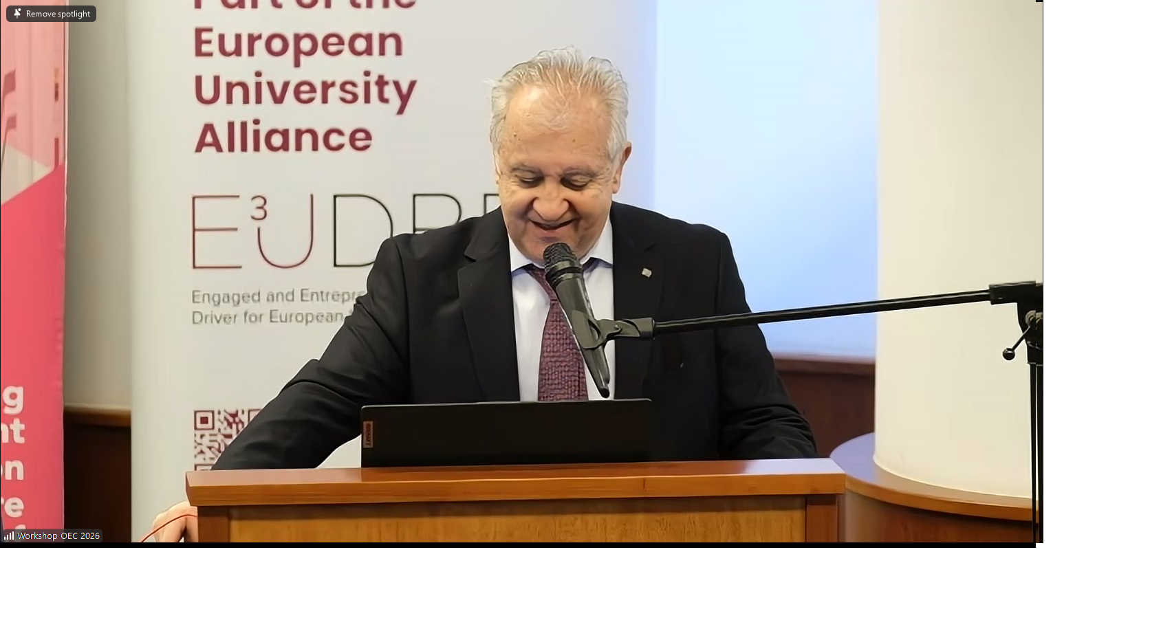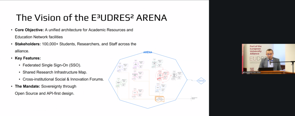 Şl. dr. ing. Andrei Ternauciuc (UPT) a detaliat arhitectura E³UDRES² ARENA — ecosistemul digital al alianței, bazat pe autentificare federată, microservicii open-source (Moodle, Nextcloud, Keycloak) şi integrarea certificatelor digitale prin blockchain (EBSI). Totodotă, acesta a prezentat în locul Prof. dr. Carmen Holotescu sesiunea despre GenAI şi ABC Learning Design, prezentare care a demonstrat cum AI generativă poate automatiza analiza cursurilor universitare şi poate facilita trecerea de la OER la practici educaționale deschise.