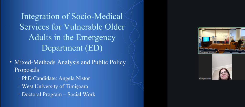 Dr. Angela Nistor (Universitatea de Vest din Timişoara — online) a prezentat rezultatele unui studiu mixt privind integrarea serviciilor sociale şi medicale pentru vârstnicii vulnerabili în Unitățile de Primiri Urgențe, cu propuneri concrete de politici publice.