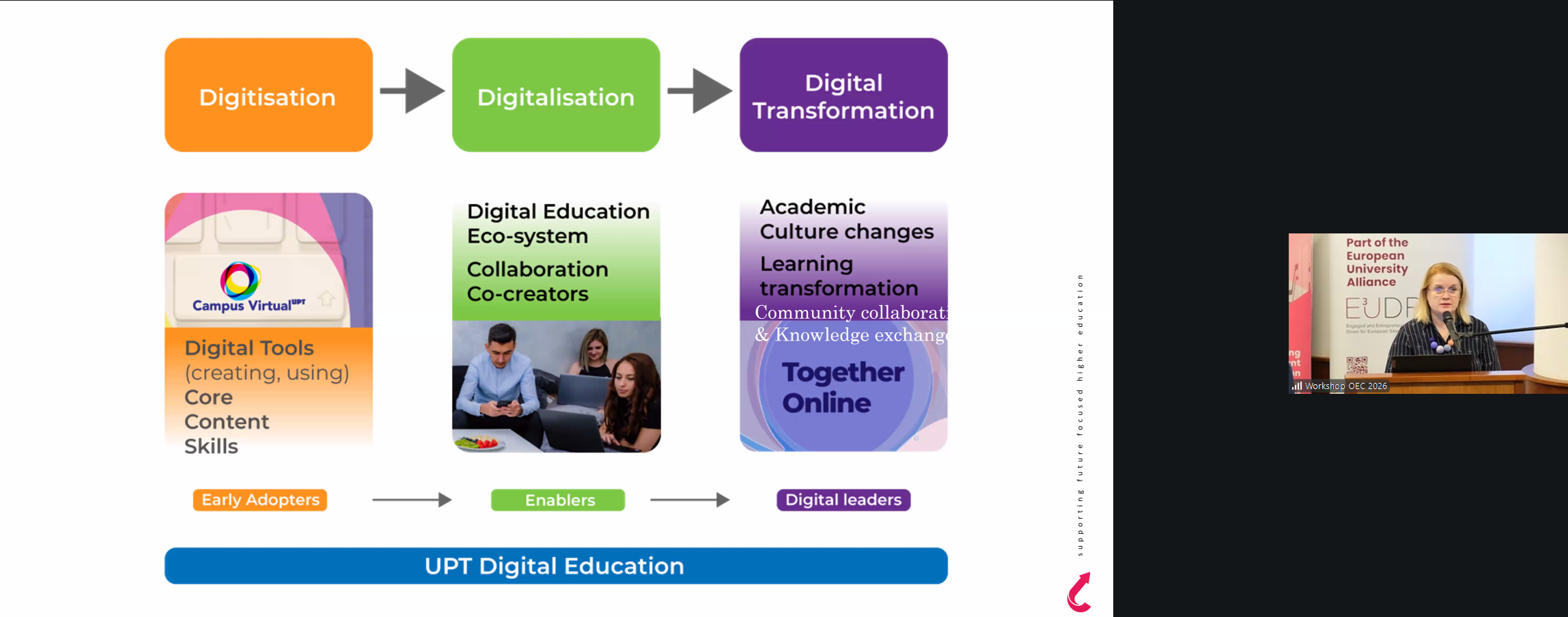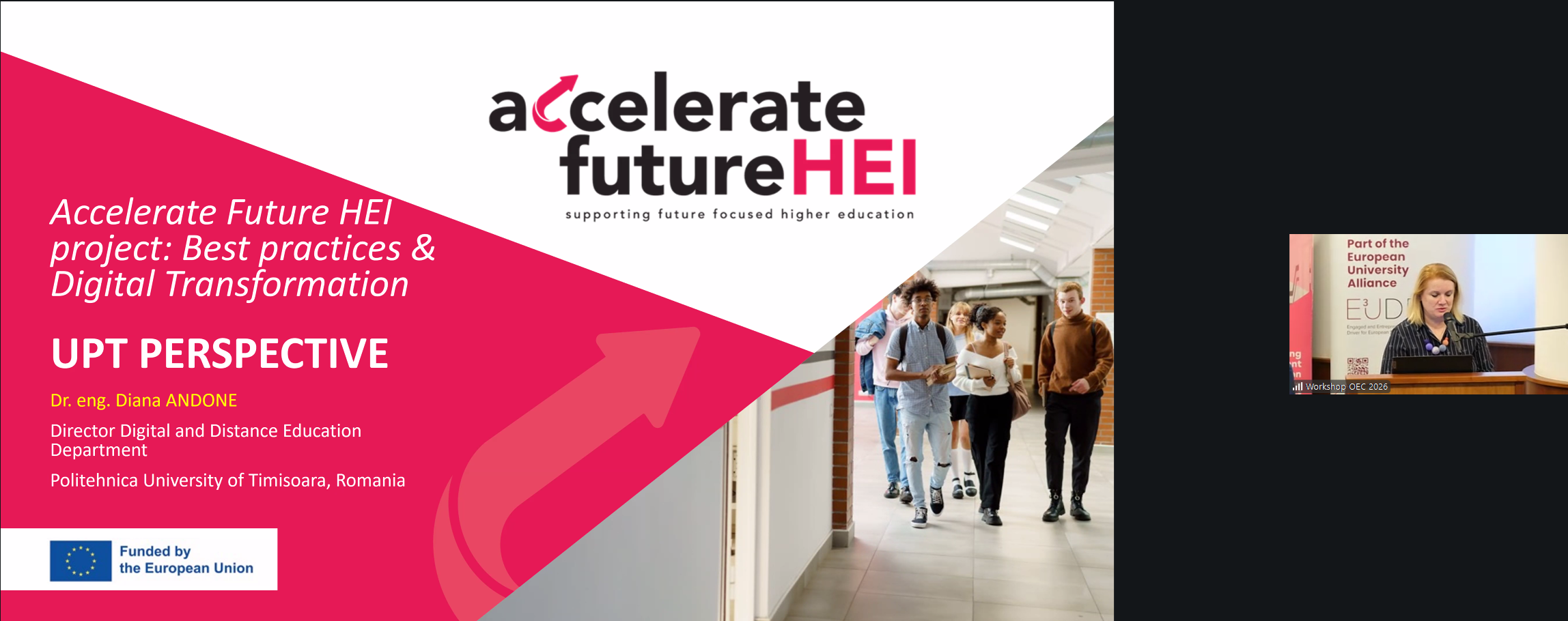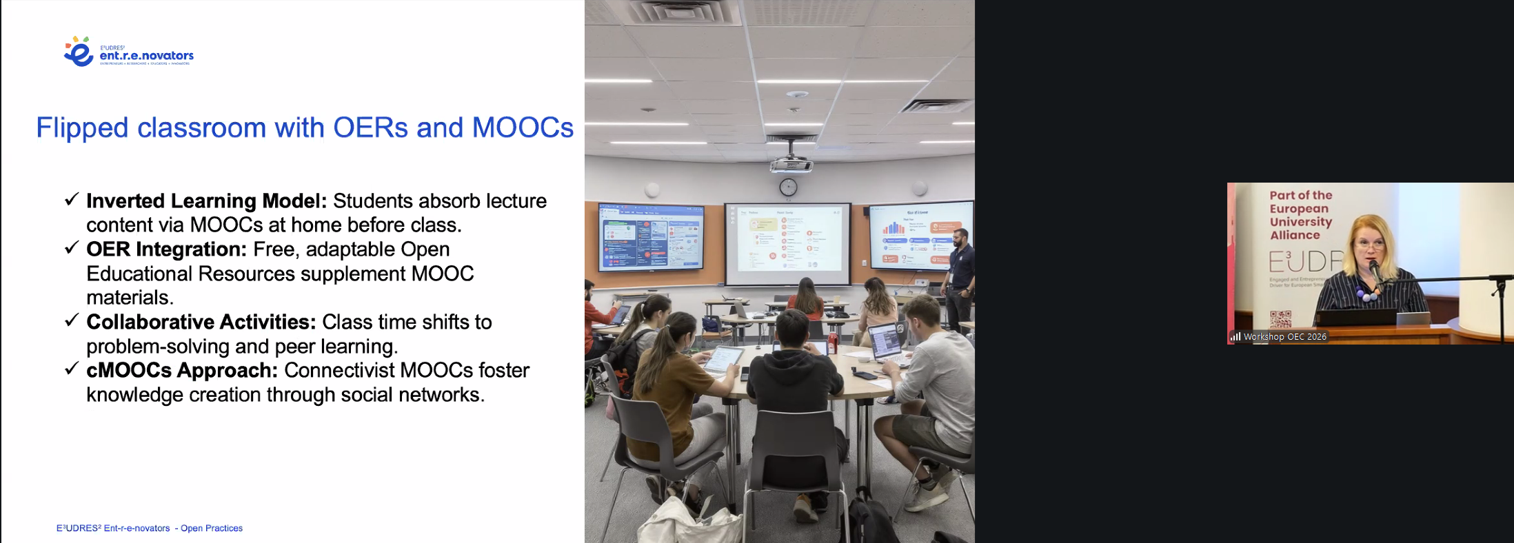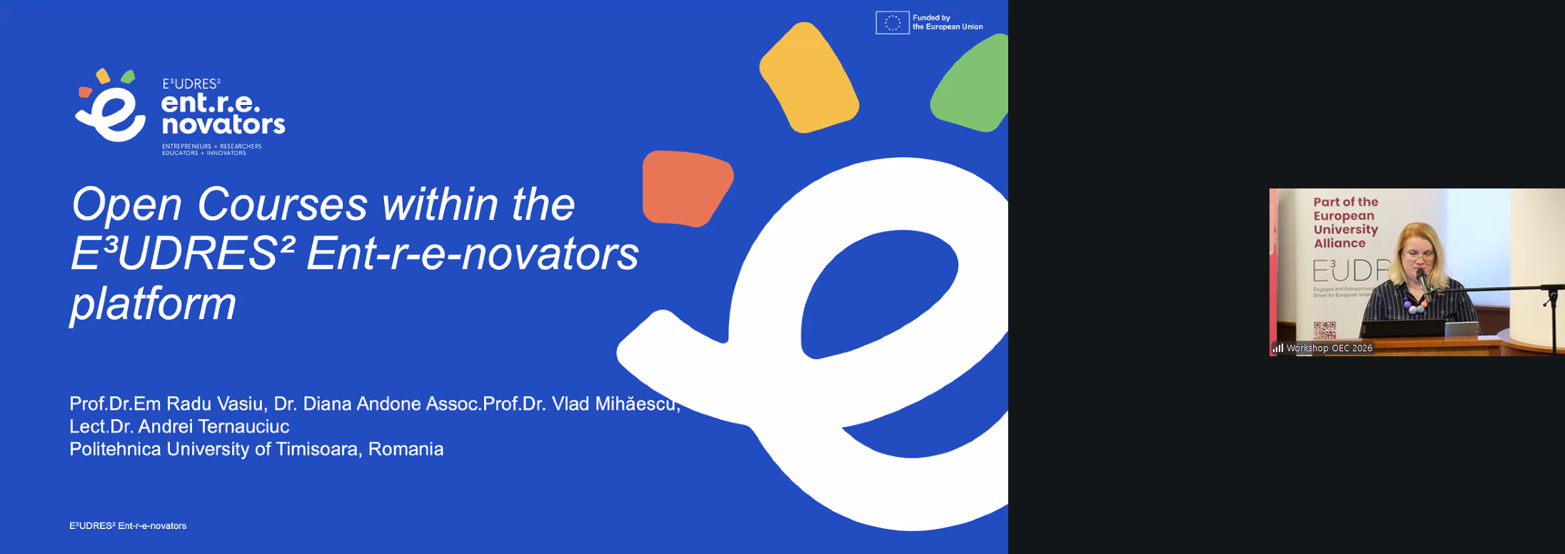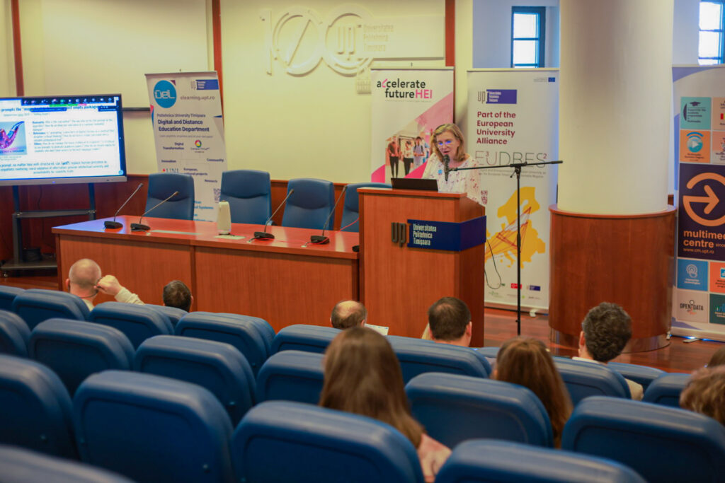 Dr. ing. Diana Andone (UPT) a prezentat, în două sesiuni distincte, proiectul Accelerate Future HEI — cu accent pe transformarea digitală şi cele mai bune practici instituționale — şi cursurile deschise integrate în platforma E³UDRES² Ent-r-e-novators, evidențiind modelul flipped classroom şi recunoaşterea competențelor prin Open Badges.