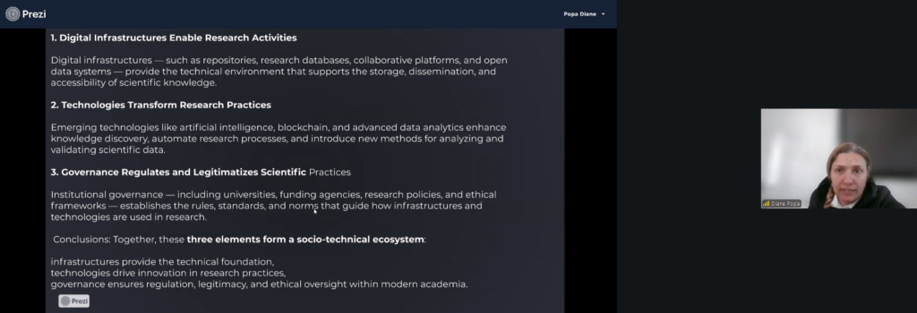Diane Popa (Liceul Sportiv „Florin Fleşeriu”, Sebeş — online) a încheiat workshopul cu o prezentare despre interdependențele dintre Open Science, infrastructurile digitale şi tehnologiile emergente, subliniind că transformarea deschisă a cercetării este în esență una epistemică, nu doar tehnică.