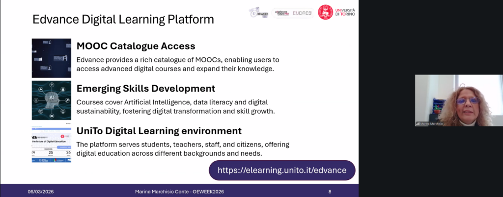 Marina Marchisio (Universitatea din Torino) a prezentat proiectul Edvance Digital Education Hub, un ecosistem colaborativ format din 16 universități italiene, cu peste 150 de cursuri MOOC în domenii precum IA, alfabetizarea datelor şi sustenabilitatea digitală.