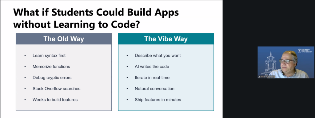 Senior Lect. Mark Frydenberg (Bentley University, SUA — online) a captivat audiența cu o demonstrație live de vibe coding — o abordare prin care studenții pot crea aplicații funcționale folosind prompturi simple, fără cunoşterea prealabilă a sintaxei de programare, cu AI în rolul de co-creator.